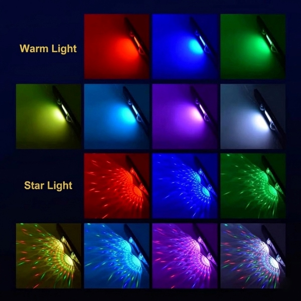 Режими на осветление: топло бяло, топло + многоцветен цикъл, звезди + звуков контрол, статични звезди, високoинтензивен звуков стробоскоп