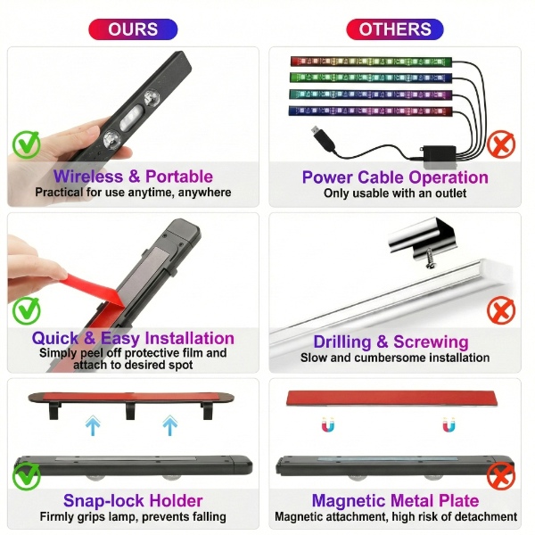Залепи магнитната подложка върху всяка равна повърхност, щракни LUMEZIN върху нея, свържи веднъж към USB за зареждане – без пробиване, без кабели, без четене на инструкции. Батерията от 300 mAh издържа седмици с едно зареждане, а функцията за памет възстановява последната настройка веднага щом го включиш.