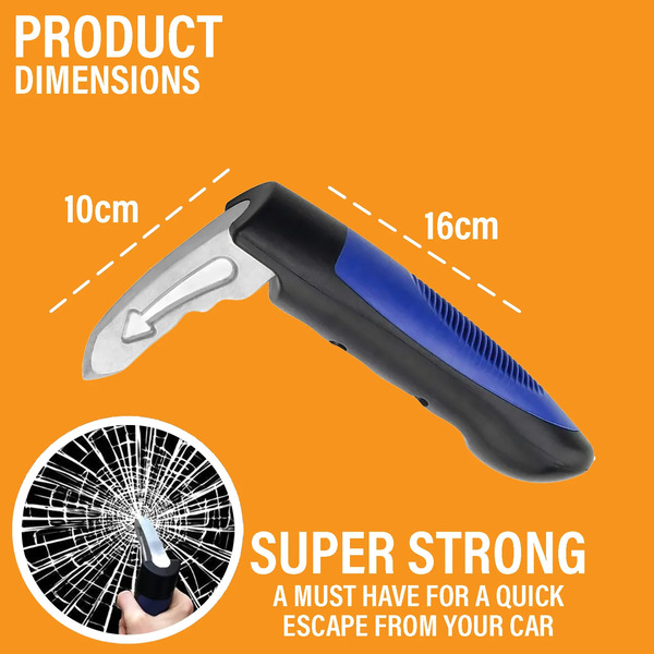 Функции: Счупване на прозорци, рязане на предпазни колани, LED фенерче (презареждащо се), свирка и помощна дръжка
