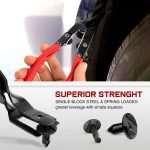 Пружинният лостов механизъм превръща малко движение на ръката в контролирана сила – позиционираш главата, стискаш, щипката се освобождава. Клещите работят с кръгли щипки в вратите и таванните панели, късият лост премахва квадратни крепежи в брони и прагове, дългият лост достига дълбоки крепежи в таблото и подкалниците без неудобни ъгли.