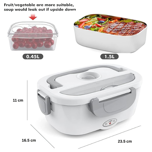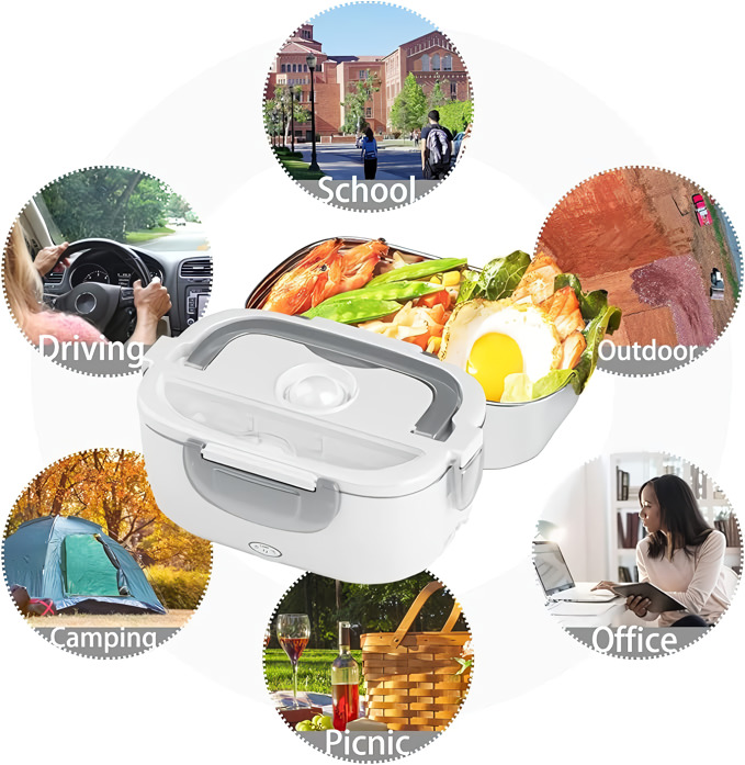 Двете подвижни PP отделения държат основното ви ястие и гарнитурата отделно – и след това и двете отиват направо в съдомиялната машина. Работи в офиса, в колата, на строителна площадка или във всяка стая с електрически контакт.