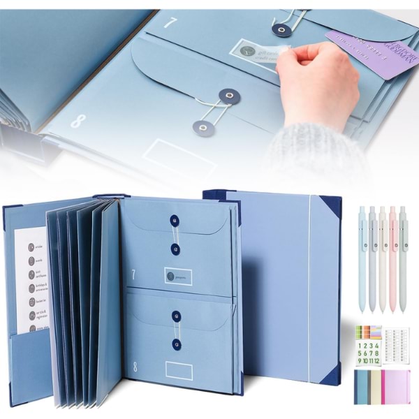 Включва 10 разширяеми плика (6 пълноразмерни, 4 полуразмерни), които побират до 10 листа всеки.