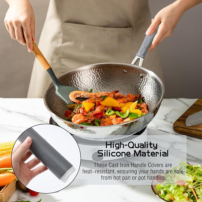 Нашите силиконови покрития са проектирани така, че да са съвместими с широк спектър от размери на дръжките на тенджери и тигани, което ги прави универсални и адаптивни кухненски аксесоари, идеални за чугунени тигани и тигани с плоско дъно.